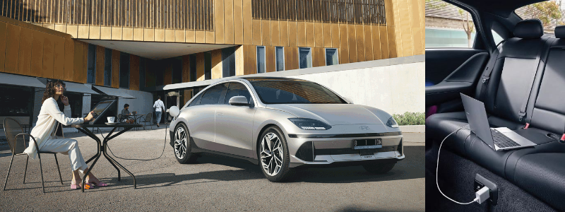Fitur V2L memungkinkan IONIQ 6 menjadi sumber daya listrik sebesar 3,6 kW untuk penggunaan perangkat elektronik, menambah kemudahan dan kenyamanan Anda saat dalam perjalanan.