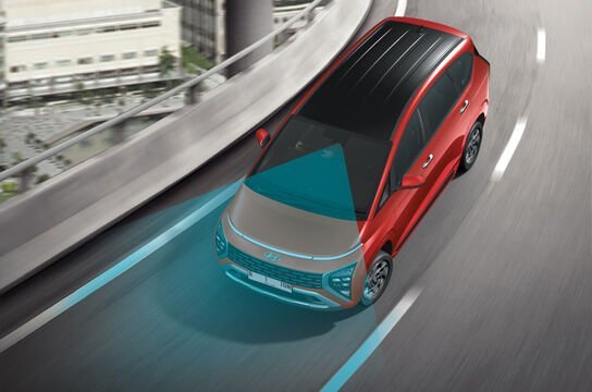 Kamera depan melacak penanda garis jalur dan membantu menjaga kendaraan tetap aman di tengah jalur.